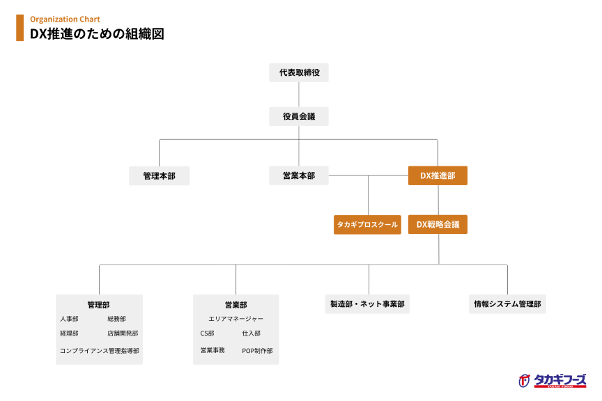 「DX戦略会議」や「タカギプロスクール」での過程において、DX推進に適した人材の発掘・育成を行っています。 また、営業部の嘱託社員(ベテラン社員)を技術指導員として召集することで、現管理職(エリアマネージャー)へのデジタル技術指導を強化し、販売管理への活用を促す他、将来的にDX指導員になり若手の育成に携わってもらいます。 デジタル技術・IT知識の修得、DXワークショップなどを通し、指導員も含めた人材育成に努め、「ITパスポート」「DX検定」「DXビジネス検定」等の資格取得に取り組みます。